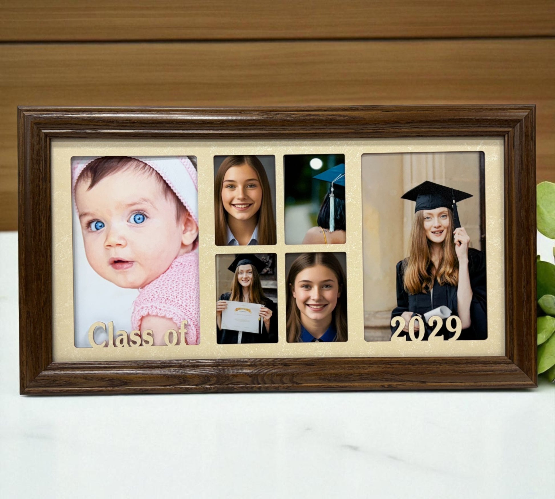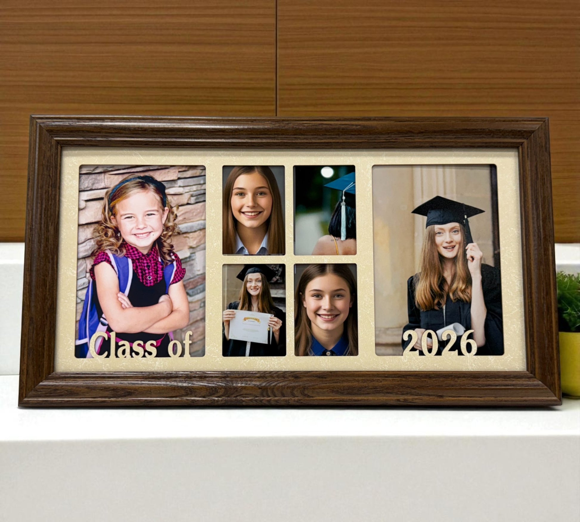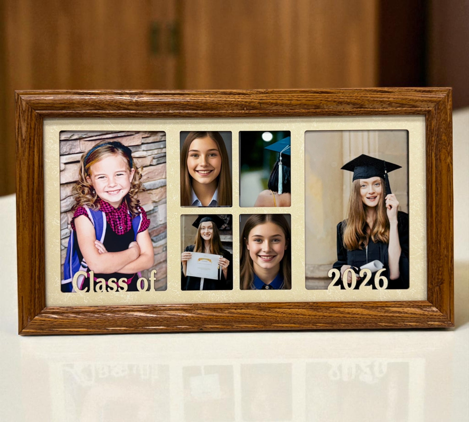 Our Custom Graduation Frame is designed to capture every proud moment of your graduate’s journey. Made from solid oak wood and paired with a precision laser-cut mat, this elegant frame features six openings — perfect for displaying senior portraits, class photos, and graduation memories. Each frame is personalized with your chosen year and finished in your selected color and mat combination for a truly one-of-a-kind display.