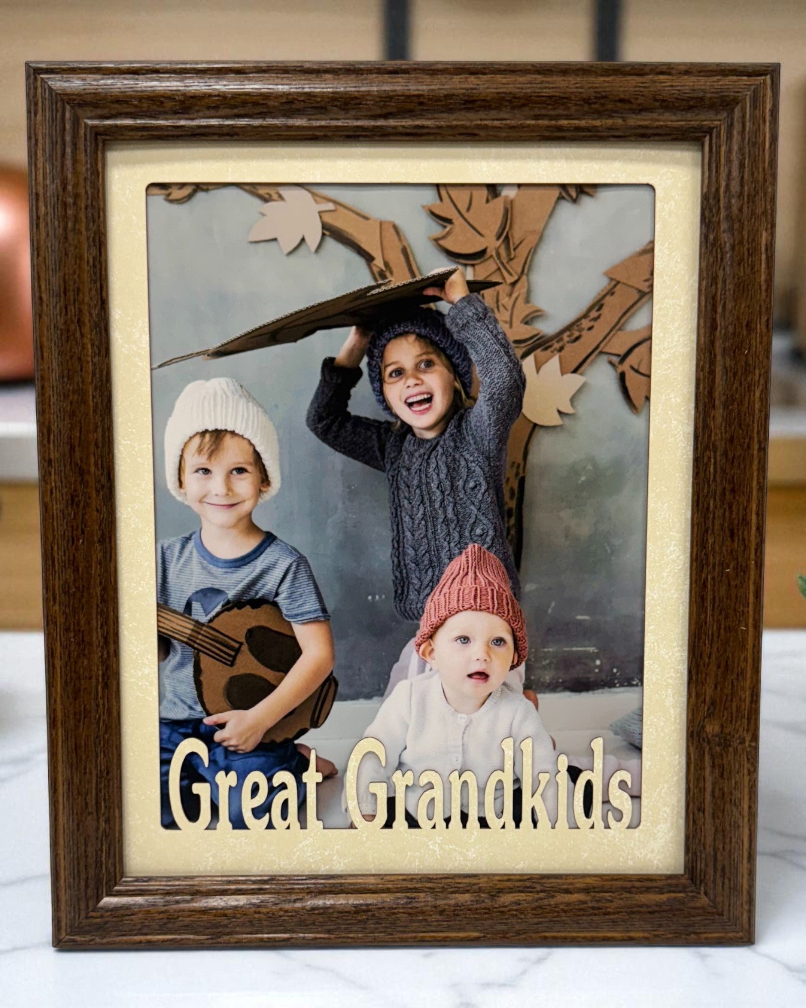 Available in multiple frame sizes and orientations, this Grandkids Picture Frame beautifully complements any home. Whether displayed in your living room or gifted to grandparents, it serves as a warm reminder of the love that spans generations.